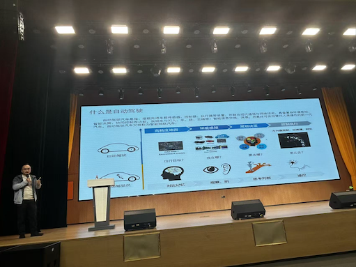 讲座中,肖雪平老师以超过十三年深耕技术领域的丰富经历为切入点,从商业大数据应用系统开发一路讲到智能网联汽车教学研发,让同学们直观感受到人工智能与产业技术演进的加速度与复合型人才的重要性。同时,他结合与百度在智能网联领域的深度合作实践,生动讲解了自动驾驶、车路协同、智能交通等创新技术的最新发展动态。