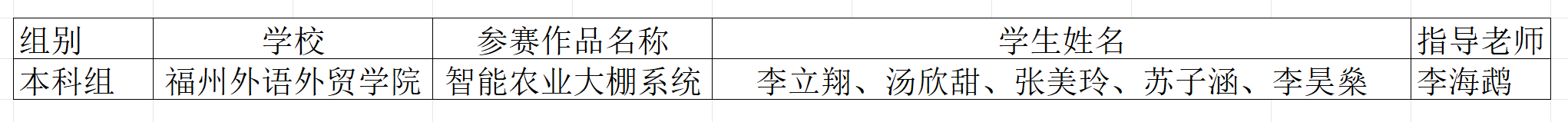根据《关于举办2025年海峡大学生人工智能创意赛的通知》,大赛决赛于2025年10月24日至25日在福州大学举行。经专家组评审,我院李海鹉老师指导的团队(团队成员:李立翔、汤欣甜、张美玲、苏子涵、李昊燊)凭借参赛项目《智能农业大棚系统》荣获二等奖。