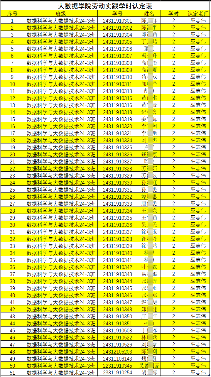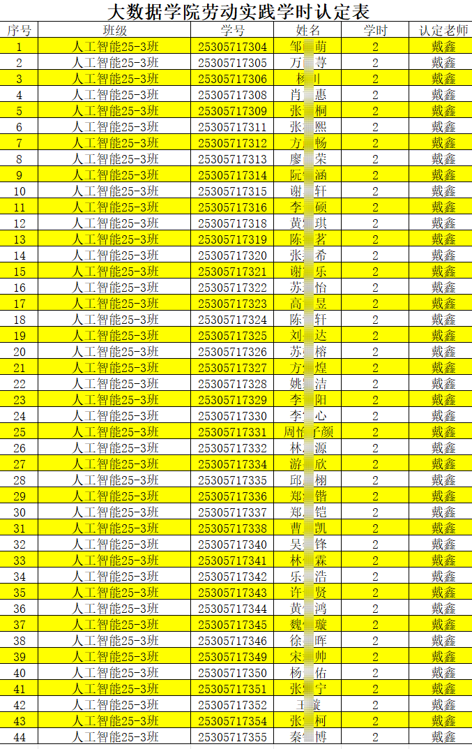 【劳动筑基 实践育人】第十周劳动实践纪实 秋意渐深,天朗气清。11月4日,大数据学院数据科学与大数据技术24-3班、数据科学与大数据技术24-4班和人工智能25-3班、人工智能25-4班的同学们,怀揣着对校园的热爱,分别奔赴指定区域,开展了一场有序且充实的校园清洁劳动实践活动,用双手为校园环境“焕新颜”。 活动开始前,各班结合清洁区域特点,提前做好分工安排:数科24-3班负责教工宿舍1号楼到东区10、11号学生宿舍楼周围的主干道与绿化带,数科24-4班则聚焦东区后门到风车处、北区到东区6号学生宿舍楼新建栈道及6号宿舍楼周围的主干道、栈道与绿化带。人工智能25-3班负责宿舍1号楼周边绿化带及主干道,人工智能25-4班负责校门口周边绿化带及主干道。明确的区域划分,让同学们一到现场便迅速进入状态。 手持垃圾夹、垃圾袋等工具,同们化身校园“美容师”,认真清扫每一处角落。主干道上,大家弯腰捡拾散落的纸屑、塑料瓶,确保路面干净整洁;绿化带中,有人细致清理隐藏在草丛里的烟头、杂物,避免垃圾污染土壤;新建栈道上,同学们更是格外用心,逐一擦拭栏杆、清理缝隙中的灰尘,让崭新的栈道始终保持清爽模样。劳动过程中,没有同学叫苦喊累,大家相互配合、彼此协助,遇到较重的枯枝落叶,便几人合力搬运,默契十足的身影成为校园里一道亮丽的风景线。 此次劳动实践,不仅让校园环境变得更加洁净雅致,更让同学们在亲身实践中体会到劳动的价值。看着自己清扫后的区域焕然一新,同学们脸上都洋溢着满满的成就感。大家纷纷表示,今后会更加珍惜校园环境,也愿意继续参与此类劳动活动,用实际行动守护校园的美好。 劳动虽短,意义绵长。同学们用汗水诠释了责任与担当,也为共建美丽校园注入了青春力量。相信这份劳动精神会持续传递,带动更多同学共同维护校园环境,让我们的校园始终焕发勃勃生机! d 附下周劳动实践安排 本周劳动实践学时认定表 大数据学院办公室 2025年11月8日