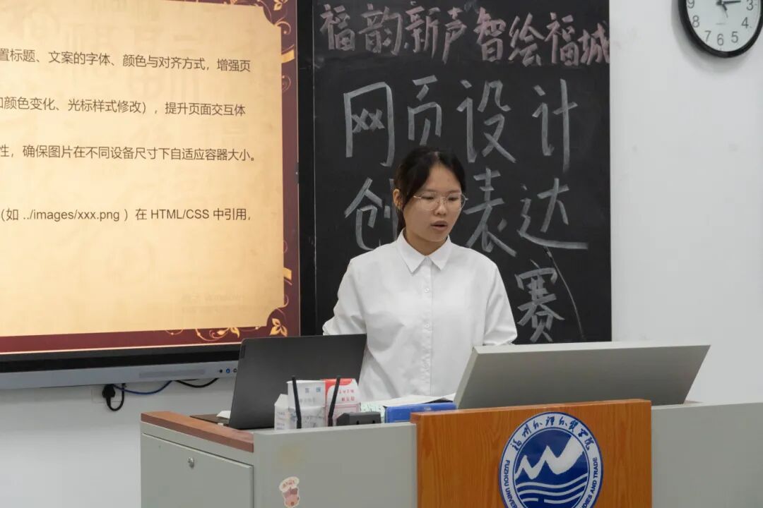 在本次大数据学院第二届数智文化节之“福韵新声·智绘福城”网页设计创意表达挑战赛的点评环节中,陈章斌老师对同学们作品彰显的创新探索精神予以高度认可。老师指出参赛作品基础扎实,但静态呈现为主的表现形式仍有优化空间,勉励大家深耕动态化、交互化设计,并着重强调,需强化理论与实践转化效能。