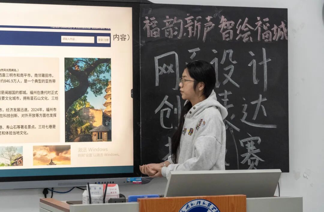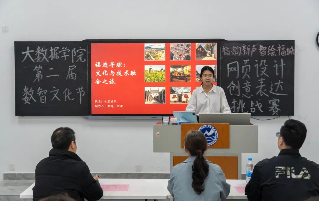 【数智引航 创新未来】大数据学院第二届数智文化节之“福韵新声·智绘福城”网页设计创意表达挑战赛圆满结束! 为了以数字技术激活传统福文化的生命力,搭建校园智慧与城市文脉的对话桥梁,我院第二届数智文化节之“福韵新声·智绘福城”网页设计创意表达挑战赛于11月18日在长乐校区人文楼2-304拉开帷幕。本次大赛特邀陈章斌老师、郑逸凡老师、王磊老师担任评委,为赛事提供专业指导。 参赛选手作品展示 从容应队 铁道游记队 你说的都队 春山可望队 别和我作队 南波万队 福韵相连队 现场答辩环节 答辩现场氛围在评委与选手的问答中升温,评委围绕“网页效果实现逻辑”“核心技术与软件应用”“后续优化方向”关键问题深入交流。从代码细节拆解、设计适配建议到优化路径探讨。既让现场氛围热烈高涨,也助力选手精准把握作品短板明确了后续的改进方向。 获奖情况 经过各队的成果展示与评委老师的专业点评,大数据学院第二届数智文化节之“福韵新声·智绘福城”网页设计创意表达挑战赛获奖名单如下: 一等奖: 南波万队 二等奖: 你说的都队 别和我作队 三等奖: 从容应队 铁道游记队 福韵相连队 优秀奖: 春山可望队 总结点评 在本次大数据学院第二届数智文化节之“福韵新声·智绘福城”网页设计创意表达挑战赛的点评环节中,陈章斌老师对同学们作品彰显的创新探索精神予以高度认可。老师指出参赛作品基础扎实,但静态呈现为主的表现形式仍有优化空间,勉励大家深耕动态化、交互化设计,并着重强调,需强化理论与实践转化效能。 大数据学院第二届数智文化节“福韵新声 智慧福城”网页设计挑战赛,充分彰显数院学子的创意才情与专业功底。参赛选手以技术为基、创意为核,推动“福”文化与福城特色在数字化表达中焕发新活力。愿同学们秉持创新执着与文化热忱,深耕专业领域,续写奋进华章。 大数据学院办公室 2025年11月23日