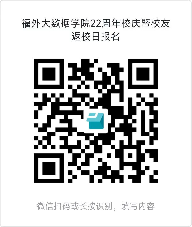 【福外22年】“廿二风华正茂,数聚母校情深”福州外语外贸学院22周年校庆大数据学院校友返校日邀请函 亲爱的大数据学院校友们: 时光荏苒,岁月不居。转眼间,母校即将迎来22周年华诞,二十二载薪火相传,风雨兼程;二十二载春华秋实,桃李芬芳。无论你是已深耕行业,成为数据时代的弄潮儿;还是初心不改,在学术道路上继续攀登,母校与学院始终是你温暖的港湾与坚强的后盾。值此盛典,我们谨向遍布四海的大数据学子,致以最诚挚的问候与最深情的思念。 22周年校庆,我们诚邀你重返母校,共赴青春之约。重温同窗情谊,再叙恩师教诲,共赏校园新貌,共话大数据未来! 活动时间 报到时间:2026年4月24日(周五) 校庆暨校友返校活动:2026年4月25日(周六) 活动地点 福州外语外贸学院长乐校区 参加方式 欢迎各位校友踊跃报名参加!请于2026年4月15日9:00 前扫描下方二维码完成报名信息填写,以便学院统筹做好各项返校接待与活动安排。 联系方式 如需咨询,请联系:林老师(18558780888) 廿二芳华,情系数院。 盼君归校,共叙往昔。 同贺华诞,共赴新程。 大数据学院办公室 2026年4月9日