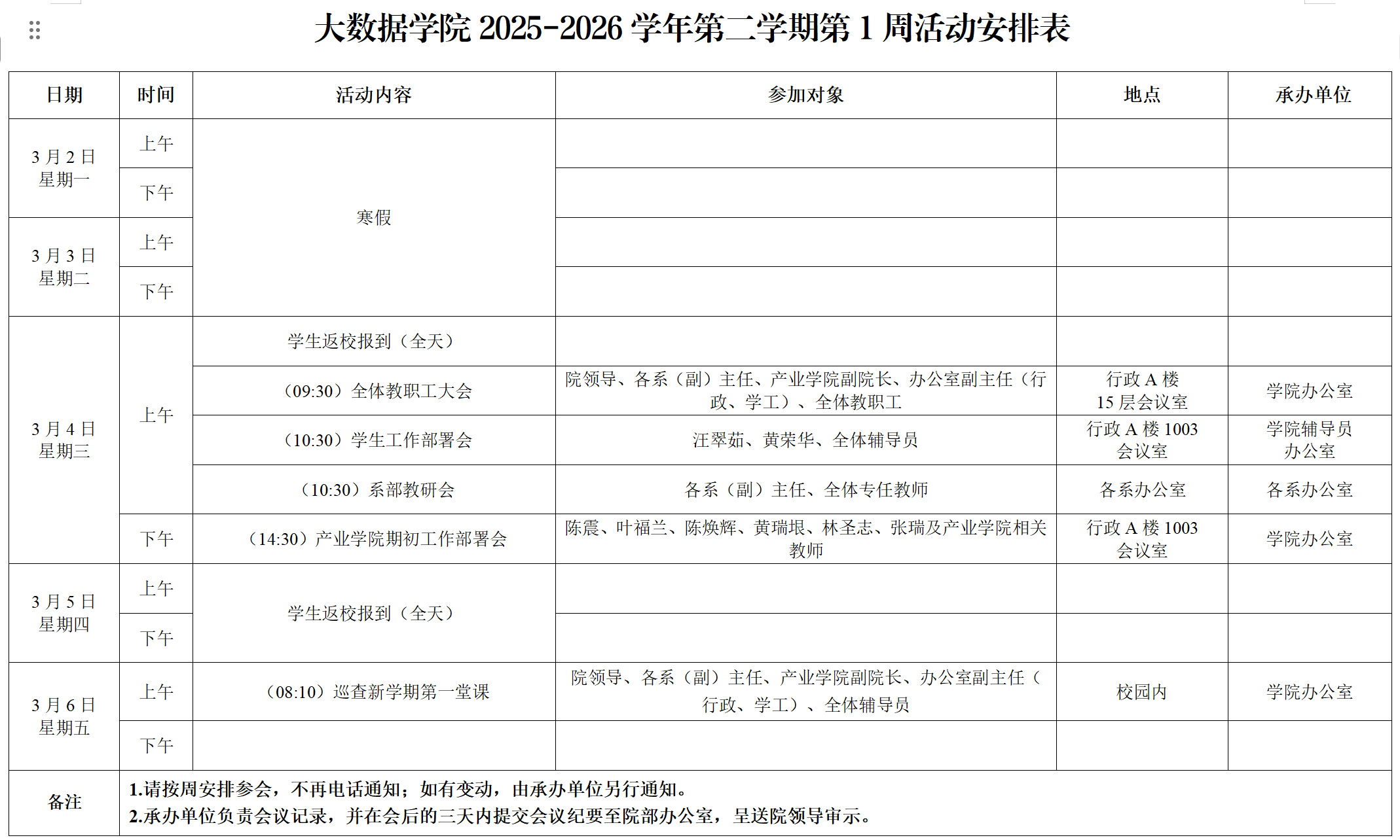 大数据学院2025-2026学年第二学期第1周活动安排表