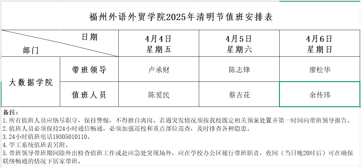 福州外语外贸学院2025年清明节值班安排表