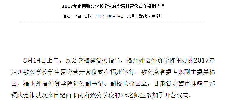 福建致公网报道:2017年定西致公学校学生夏令营开营仪式在福州举行