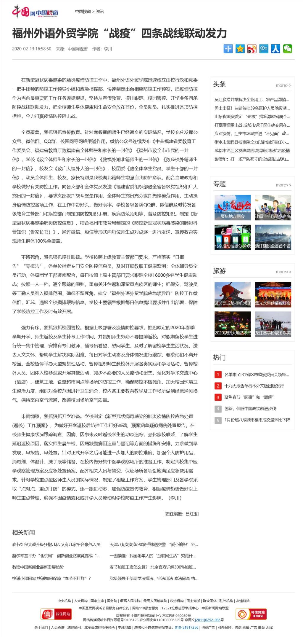 中国网中国视窗报道:福州外语外贸学院“战疫”四条战线联动发力