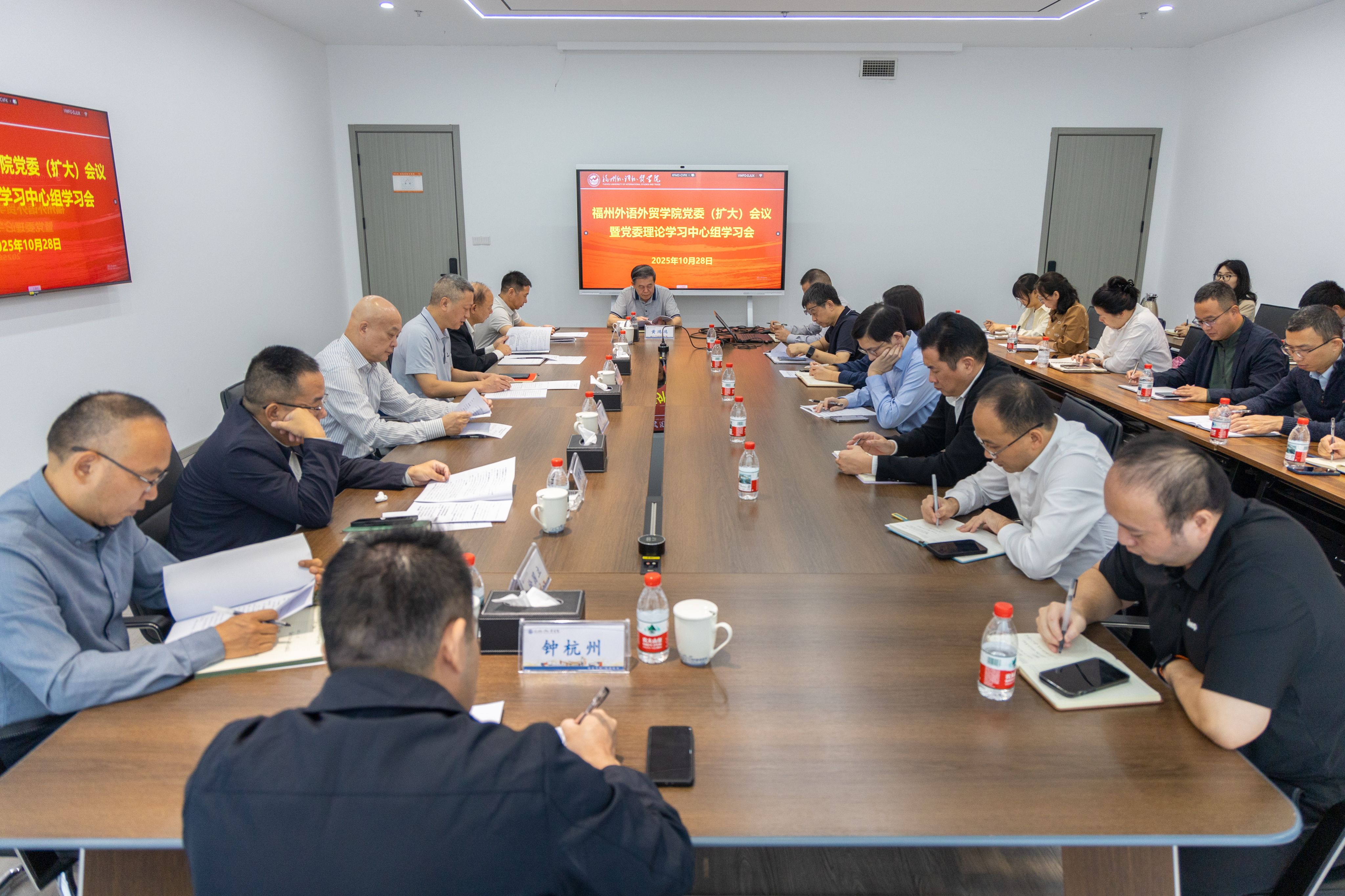 10月28日,福州外语外贸学院召开党委理论学习中心组学习(扩大)会,专题学习研讨党的二十届四中全会精神。校党委书记陈林男主持并讲话,校党委委员,党委部门负责同志,各基层党委书记,直属党支部书记等参加。