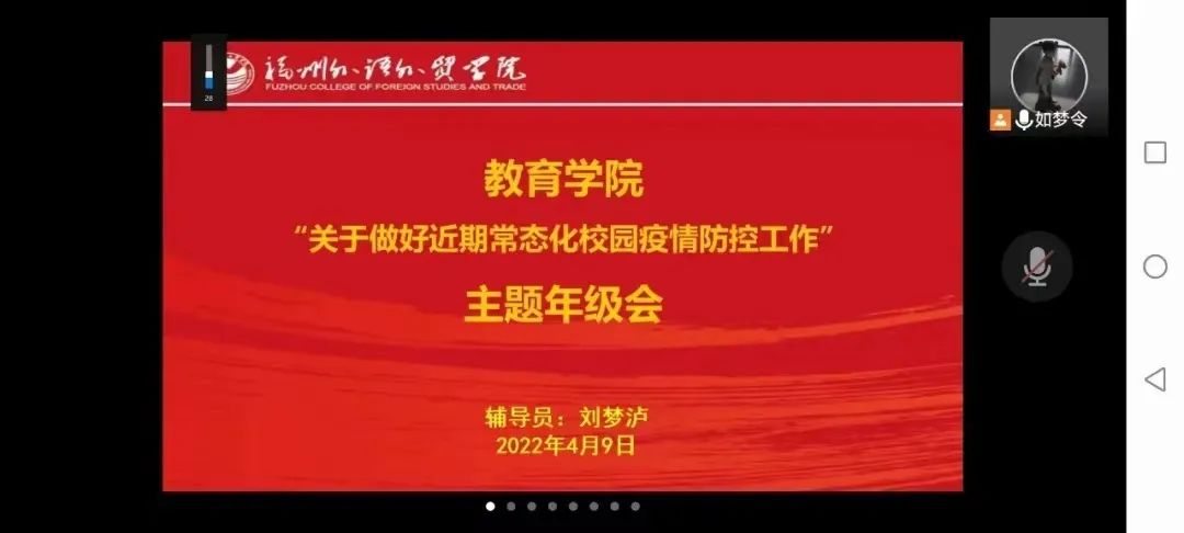4月9日,教育学院于线上召开了关于做好近期常态化校园疫情防控工作的主题年级会。