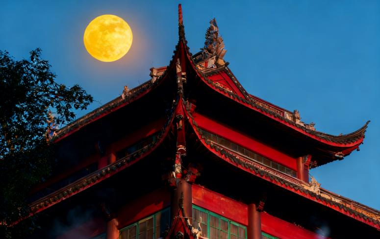 祝福语:借这帧月下古建,祝您中秋佳节,人月两圆,事事如愿!