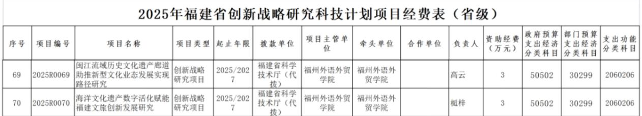 8月15日,福建省财政厅、福建省科学技术厅发布《关于安排2025年度高校产学合作等科技计划项目经费(省级)的通知》,我院高云教授负责的《闽江流域历史文化遗产廊道助推新型文化业态发展实现路径》、栀梓教授负责的《海洋文化遗产数字活化赋能福建文旅创新发展研究》获福建省创新战略研究科技计划项目立项。