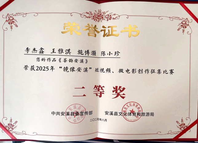 近日,由中共安溪县委宣传部、安溪县文化体育和旅游局主办,安溪县影视人才协会承办的“镜像安溪”短视频、微电影创作征集活动圆满落幕。我院广播电视编导专业2023级李杰鑫、施博灏、王雅淇三位同学组成的队伍,在百余支参赛队伍中脱颖而出,凭借出色的作品斩获二等奖,为我院再添荣誉!