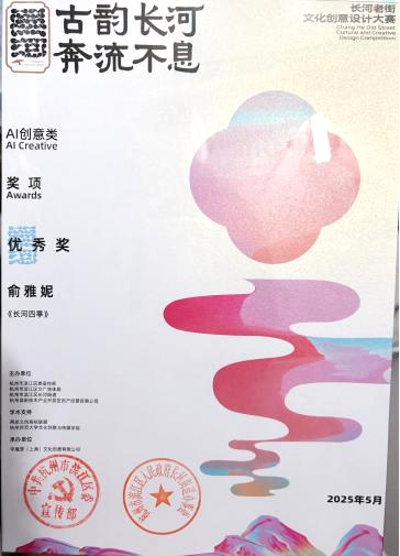 近日,由杭州市滨江区委宣传部、杭州市滨江区文广旅体局、杭州市滨江区长河街道、杭州高新技术产业开发区资产经营有限公司联合主办的“古韵长河·奔流不息—杭州长河老街文创与AI创意设计大赛”公布了大赛结果,我院视觉传达设计系学子在AI创意单元斩获佳绩,优秀奖1项,入围20项。据悉,大赛AI创意单元优秀奖仅设置5名,其中1名为我院2023级视觉传达设计3班俞雅妮同学(指导老师:陈昕)。