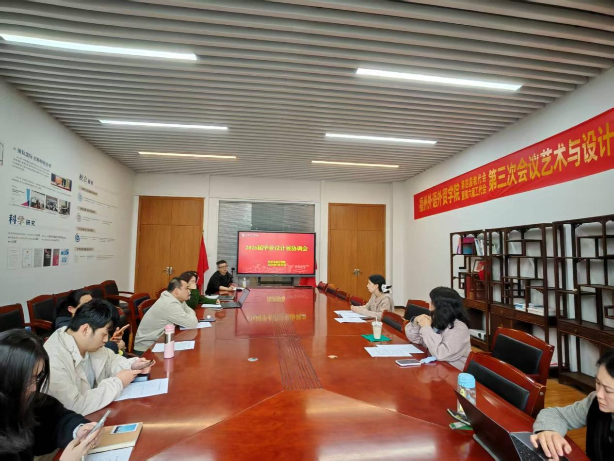 为了保障2026届毕业设计展顺利举办,进一步细化筹备分工、完善活动方案,2026年3月31日下午,艺术与设计学院于西区408会议室召开毕业设计展专项协调会。会议由王家荣老师主持,学院办公室副主任叶倩倩、各系主任及相关负责教师代表齐聚一堂,共商展览前期筹备事宜。