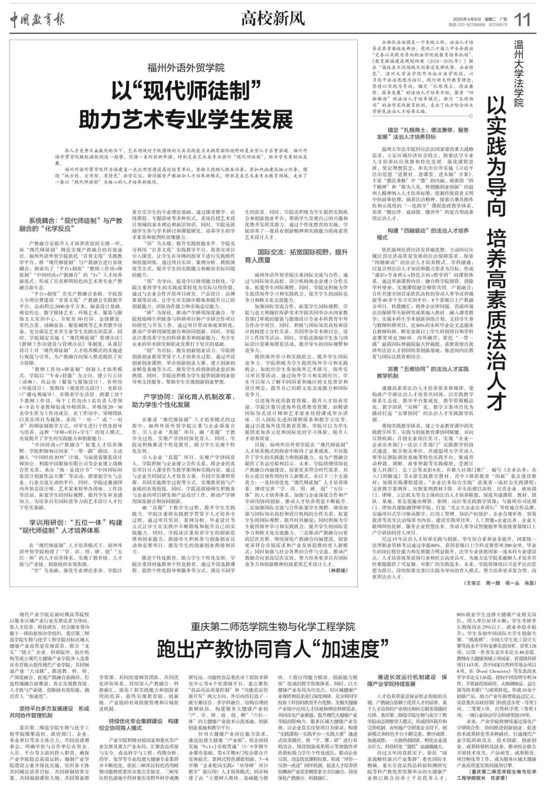 产教融合是提升人才培养质量的关键一环,而“现代师徒制”则是实现产教融合的有效途径。福州外语外贸学院依托“首善文苑”实践教学平台,将“现代师徒制”与产教融合进行系统耦合,探索出了“平台+制度”“教师工作坊+师徒制”“中国时尚+产教融合”的“3+”人才培养新范式,形成了具有鲜明特色的艺术类专业产教融合新生态。